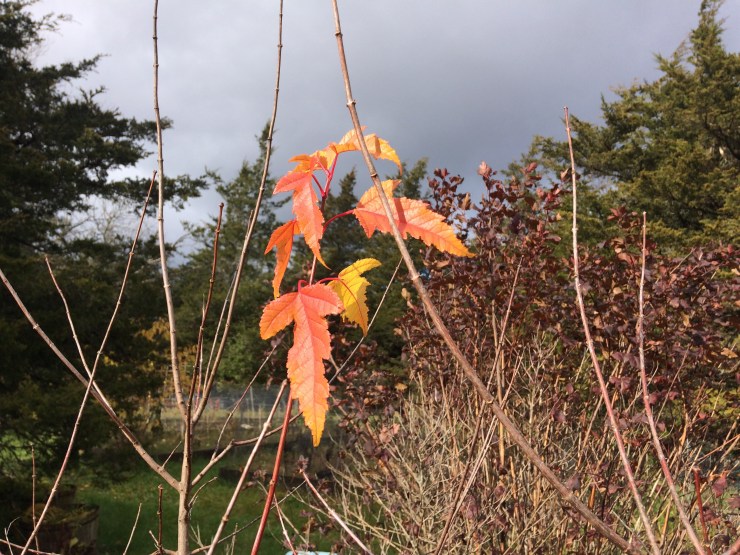 I had meant to take a picture of this tree just last week when it was fully ablaze with autumn colour. I planted it about five years ago, only ever expecting that it might live one season to the next, but it is growing to an admirable height for a dwarf tree, and it is truly eye catching with its intense orange surrounded by browns and greens and dark purples.