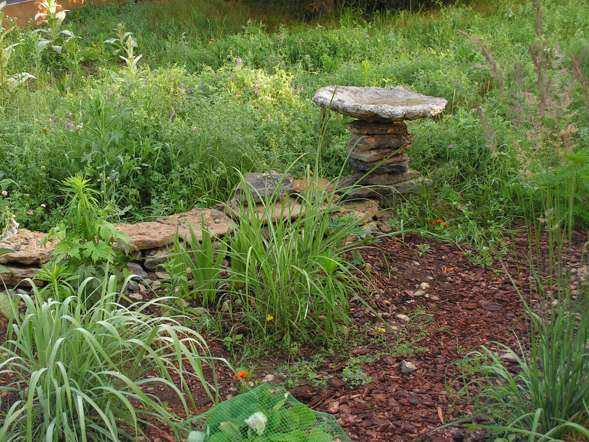 I dug a shallow depression and used a concrete mix from the hardware store. The bag of concrete weighed about 60 pounds and more disagreeable than a sack of potatoes. I mixed it in a plastic tub with the measured amount of water. I put broad leafed weeds to good use; lined the depression with a plastic bag and leaves, and then poured the wet concrete into the depression. I pressed another depression into the top of the concrete and covered the surface with more leaves, plastic and gravel, and a large stone to maintain the shape. Two days later the concrete cake was baked, and I peeled away the lining and heaved the bowl onto a stack of stones by our garden. I look forward to new visitors once the rain stops.