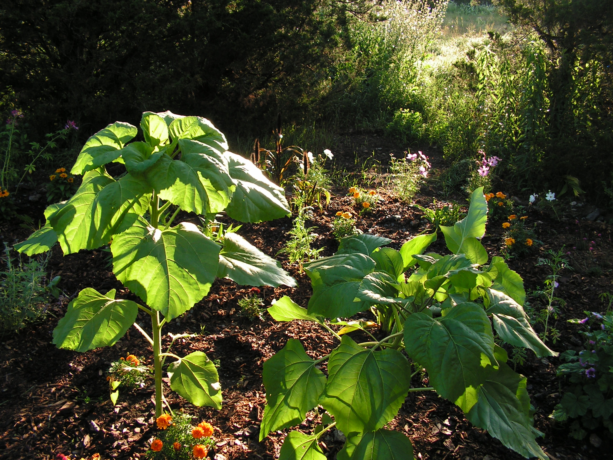 It seems all the sunflowers I grew from seedlings on our kitchen counter somehow didn’t make it, after being transplanted. But the seeds I carried in my pocket and randomly poked into the ground have taken hold with a vengeance, and if the growing season continues we may be able to use these things for firewood to get us through the winter. The funny thing is they have been the least demanding of water. Perhaps they have found our aquifer and are drinking the well dry. I may have to name them “Audrey” and “Audrey 2” if they get much bigger. They certainly have personalities and do the happy dance when I spray them with the hose.